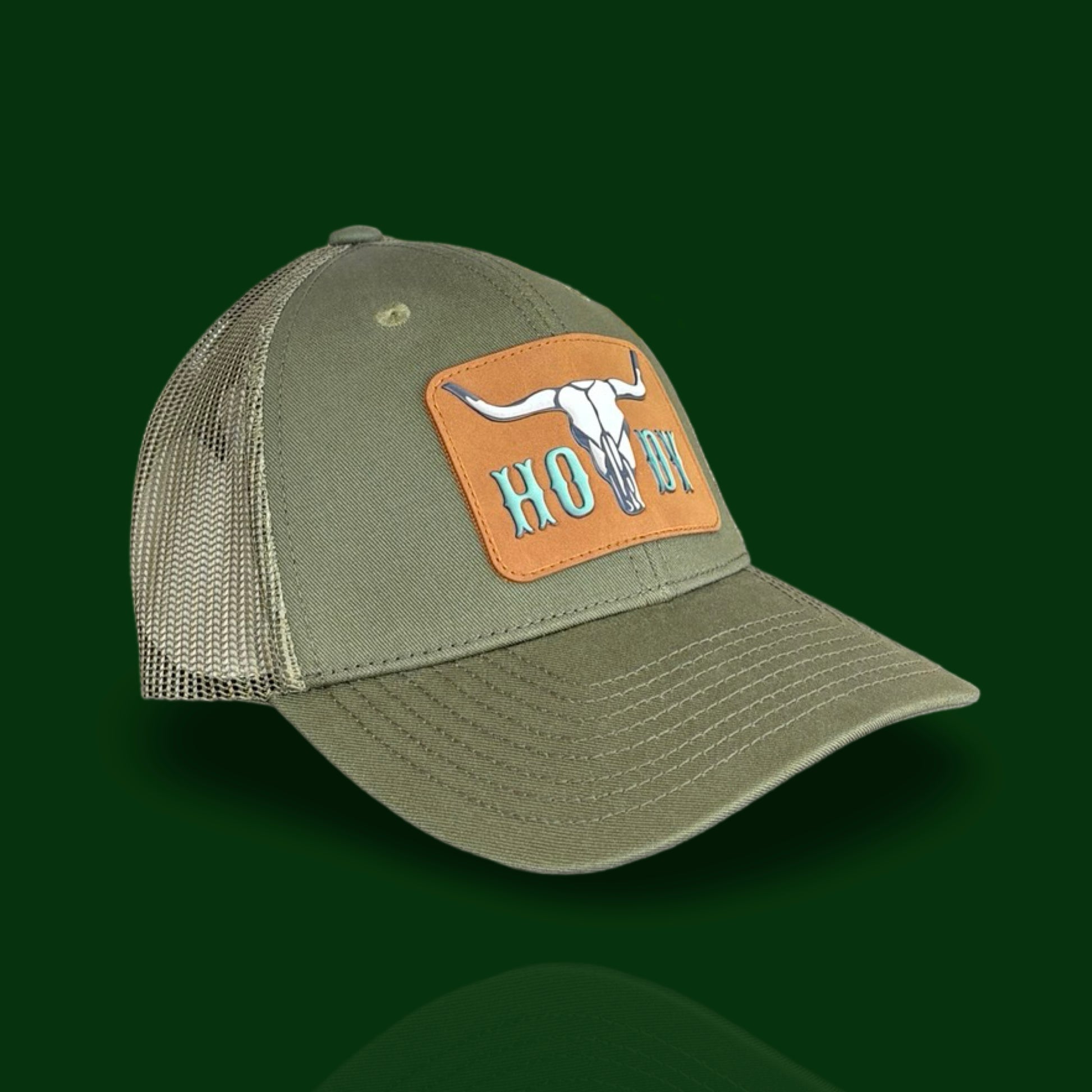 Crafted for individuals with a love for the West, this “Howdy Longhorn Trucker Hat” in olive green features a vintage-inspired leather-like patch with a prominent longhorn skull and stylized “Howdy” lettering. The breathable mesh back ensures comfort in various weather conditions.